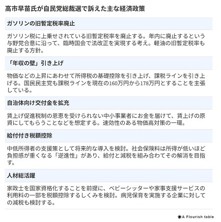 高市氏がまっさきに取り組むとみられているのが物価高対策です。なかでも「一番やりたいこと」として上げているのが、各自治体が独自の物価高対策などにお金を使える制度である自治体向けの重点支援地方交付金の拡充です。高市氏は総裁就任後の4日の会見で、中小企業や小規模事業者の賃上げや農林水産業の資材高騰対策に使えるものにしたいと述べています。そのほかにも医療や介護など国がサービス価格を決める分野の賃上げや、ガソリンと軽油の減税にも取り組むといいます。