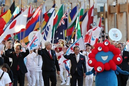 (写真・大屋根リングの下を行進するミャクミャクと日本国際博覧会協会の十倉雅和会長(左から3人目)ら=2025年10月13日/写真、図版はすべて朝日新聞社)