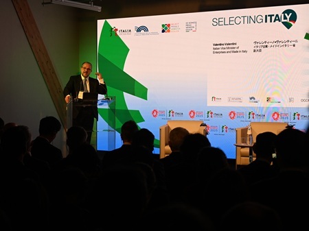 (写真・イタリア館のビジネスイベントであいさつする企業・メイドインイタリー省のバレンティーノ・バレンティーニ副大臣。同館ではこうした会合が連日開かれた=2025年4月25日)