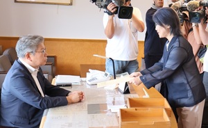 (写真・「卒業証書」とされる文書の提出を再び拒否する内容の回答書を持参した静岡県伊東市の田久保真紀市長(右)=2025年8月8日)