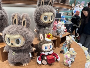 (写真・北京のポップマート1号店に並ぶ「ラブブ」のフィギュア=2025年11月11日)