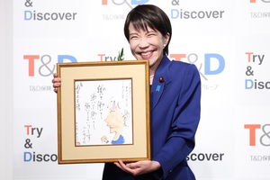 (写真・「新語・流行語大賞」の年間大賞に選ばれ、選考委員のやくみつるさんから贈られた絵を手に笑顔を見せる高市早苗首相=2025年12月1日)