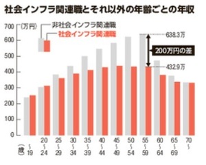 ちなみに白書では社会インフラ関連職を①医療・保健・福祉 ②保安・運輸・建設 ③接客・販売・調理の3カテゴリーにわけていますが、平均所得は①が467万円、②が447万円なのに対し、③は367万円と、相対的に低くなっていることも明らかになりました。