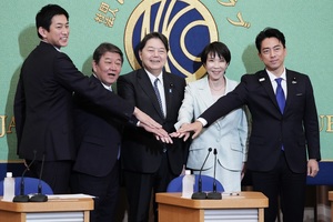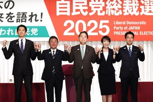 (写真・自民党総裁選の候補者共同記者会見に臨む(左から)小林鷹之元経済安全保障相、茂木敏充前幹事長、林芳正官房長官、高市早苗前経済安保相、小泉進次郎農林水産相=2025年9月23日、東京・永田町の党本部)