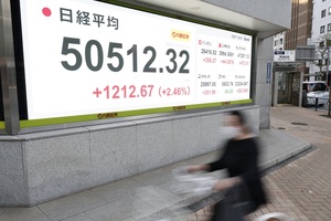 (写真・終値でも5万円を超えた日経平均株価を表示する画面=2025年10月27日)