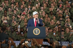 (写真・米軍の空母ジョージ・ワシントンで演説するトランプ大統領=2025年10月28日/朝日新聞社)