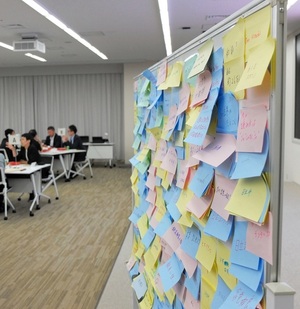 (写真・日立製作所の中途入社社員向け研修。付せんに社のイメージを書き込み、意見交換した=2025年8月、東京都台東区)