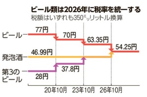酒税におけるビールの税率はかつて麦芽比率などによって3つに分かれていました。350ミリリットル当たりでビールが77円、発泡酒が46.99円、第3のビールが28円でした。1990年代後半以降、税率が低い発泡酒や第3のビールが市場を席巻し、ビールの販売数量は減り続けました。こうしたいびつな状態を改めようと、国税庁は税率の一本化を3段階で進めることにしました。2020年10月にビールの税率を下げ、第3のビールの税率を上げ、2023年10月には第3のビールの税率を上げて発泡酒と同じにし、ビールの税率を下げました。そして2026年10月には発泡酒とビールの税率が同じになり、一本化が実現します。税率が同じなら、麦芽比率が高いビールは売れ筋になるでしょう。その動きを見越し、サントリーは第3のビールとして販売している「金麦」を2026年10月から麦芽比率を50%以上に高めてビール化すると発表しました。金麦という人気ブランドは残しながら中身を「格上げ」する戦略です。