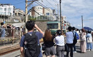 (写真・踏切近くで江ノ島電鉄の車両を撮影する観光客たち=2025年9月6日、神奈川県鎌倉市)
